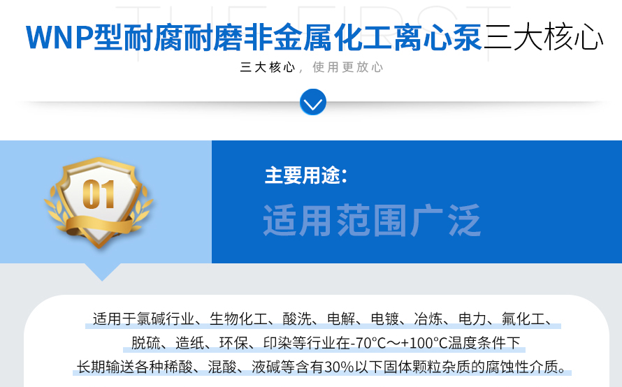 WNP、WNE、WNF型系列耐腐耐磨非金屬化工離心泵,是我公司響應(yīng)國家的號召及廣大用戶的要求,參照國外先進(jìn)技術(shù)的耐腐蝕塑料離心泵的結(jié)構(gòu)進(jìn)行了消化吸收后新開發(fā)出替代進(jìn)口的耐腐耐磨化工離心泵,該泵的性能、結(jié)構(gòu),完全達(dá)到了國外產(chǎn)品的同等技術(shù)性能參數(shù)標(biāo)準(zhǔn)。