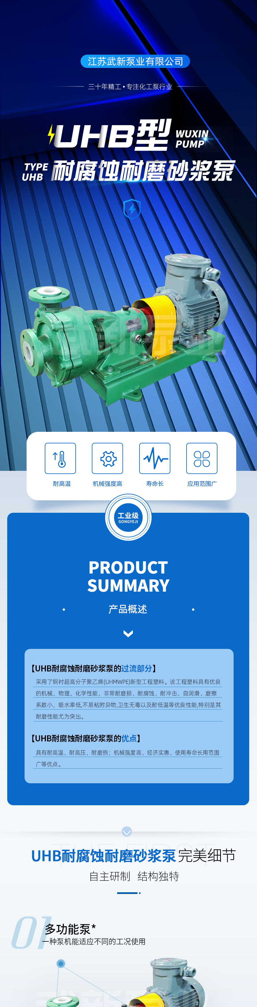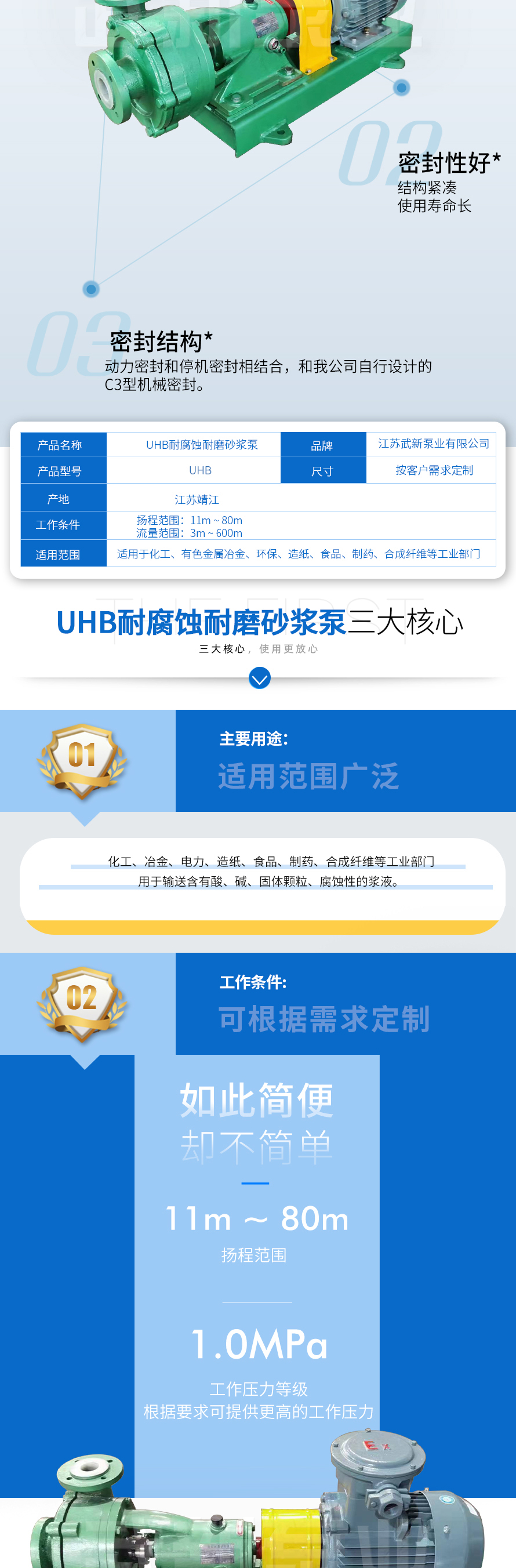 UHB型系列砂漿泵,是我公司根據(jù)廣大用戶在輸送耐腐蝕耐磨損苛刻的條件下。經(jīng)多年的研制開發(fā)的一種耐腐耐磨的化工離心泵。該泵結(jié)構(gòu)為單級單吸式,密封有: 動力密封與停機(jī)密封相結(jié)合結(jié)構(gòu)和我公司自行設(shè)計的內(nèi)裝 WXW 型(專利產(chǎn)品)機(jī)械密封。