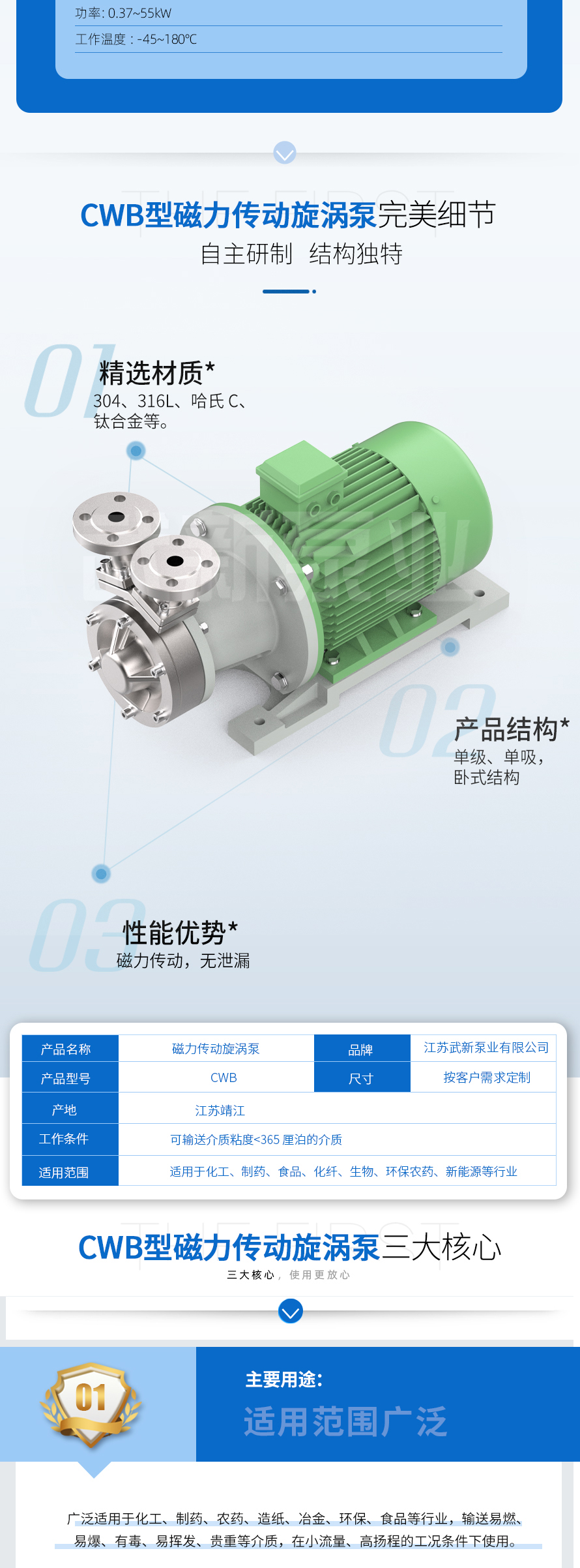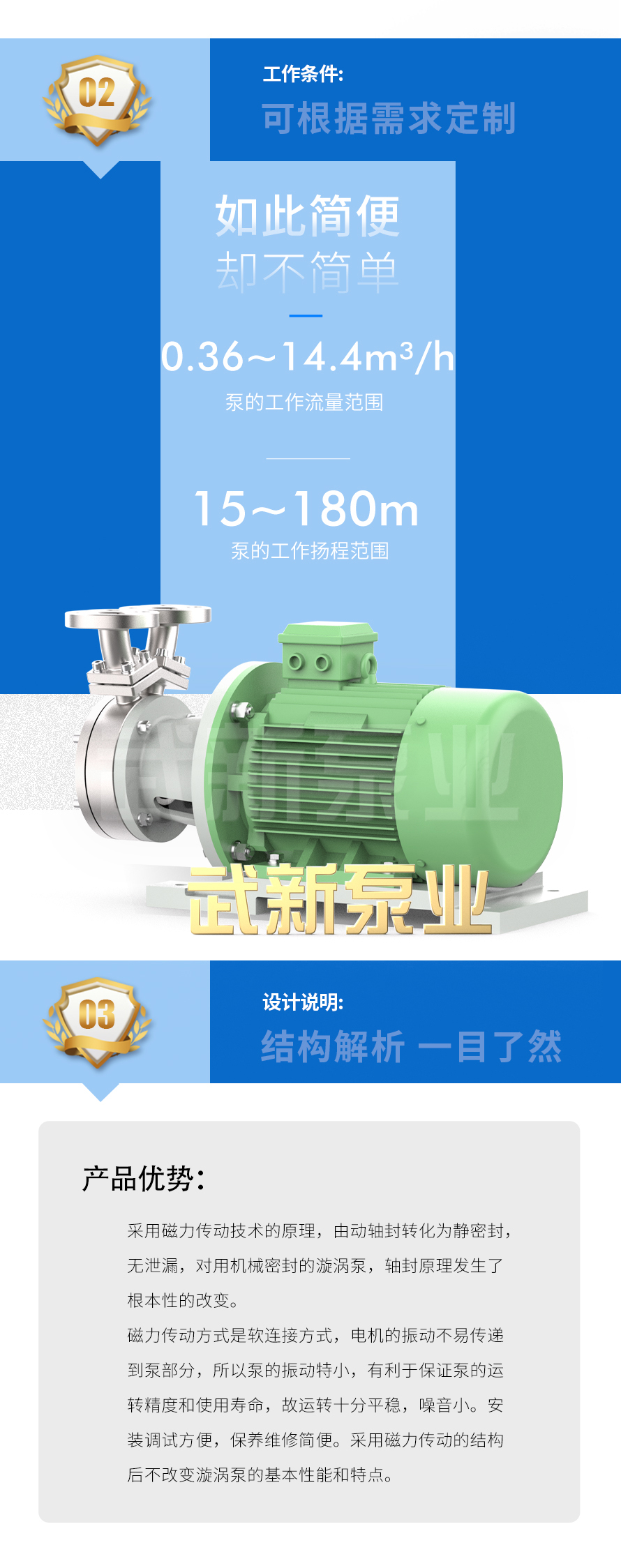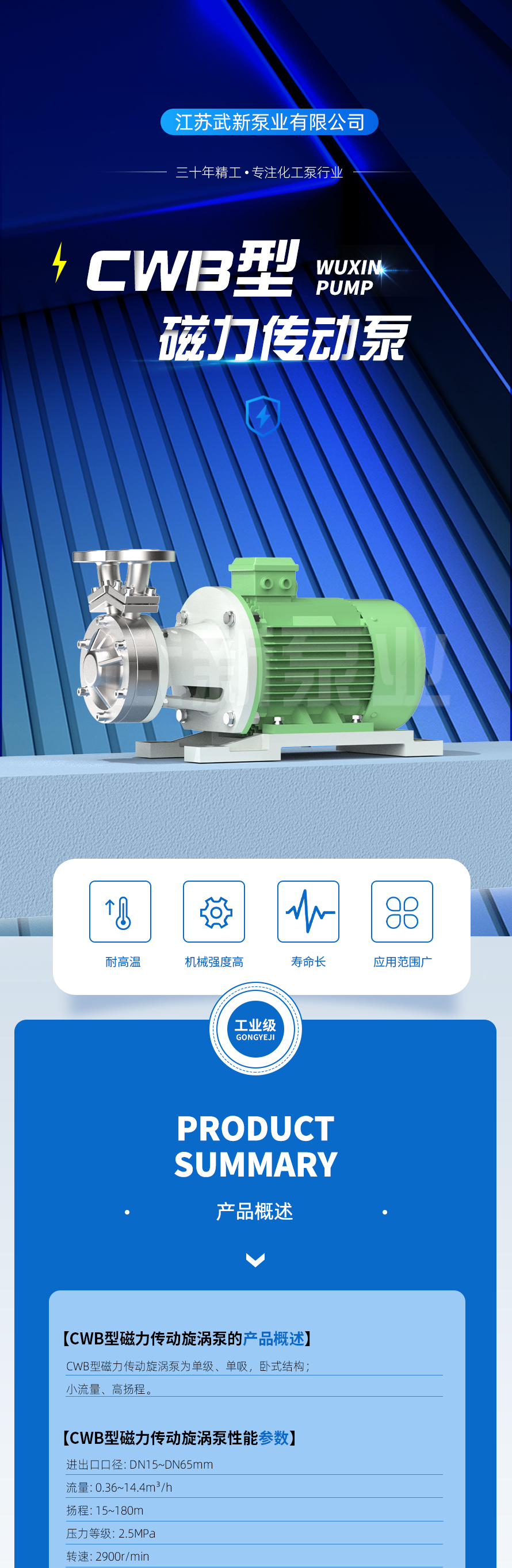 CWB型磁力傳動旋渦泵,是漩渦泵與磁力傳動技術(shù)的基本原理及應(yīng)用特點相結(jié)合的一種新型泵種,是輸送小流量高揚程、易燃、易爆、劇毒、易揮發(fā)、貴重介質(zhì)的理想用泵。