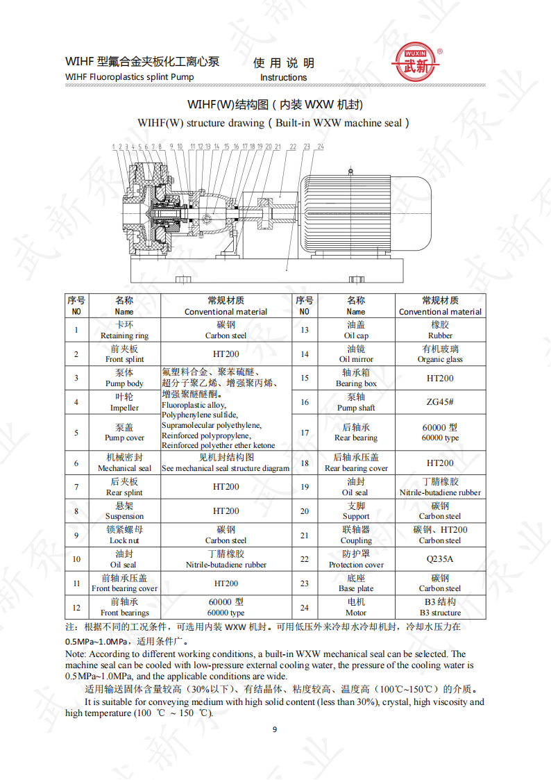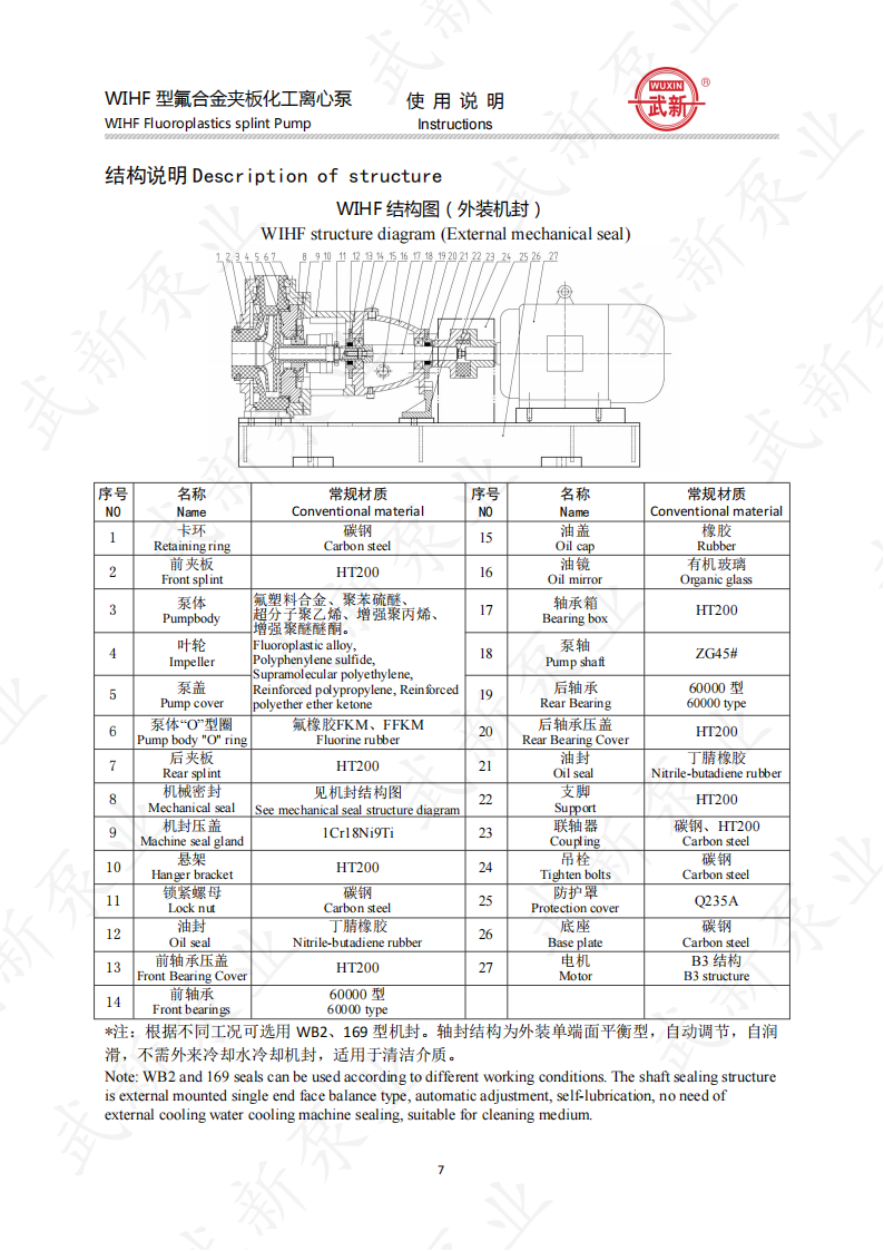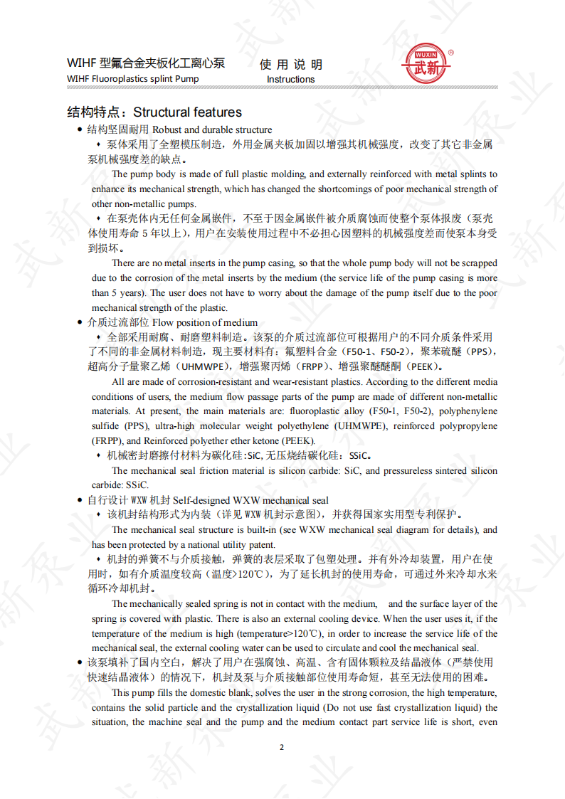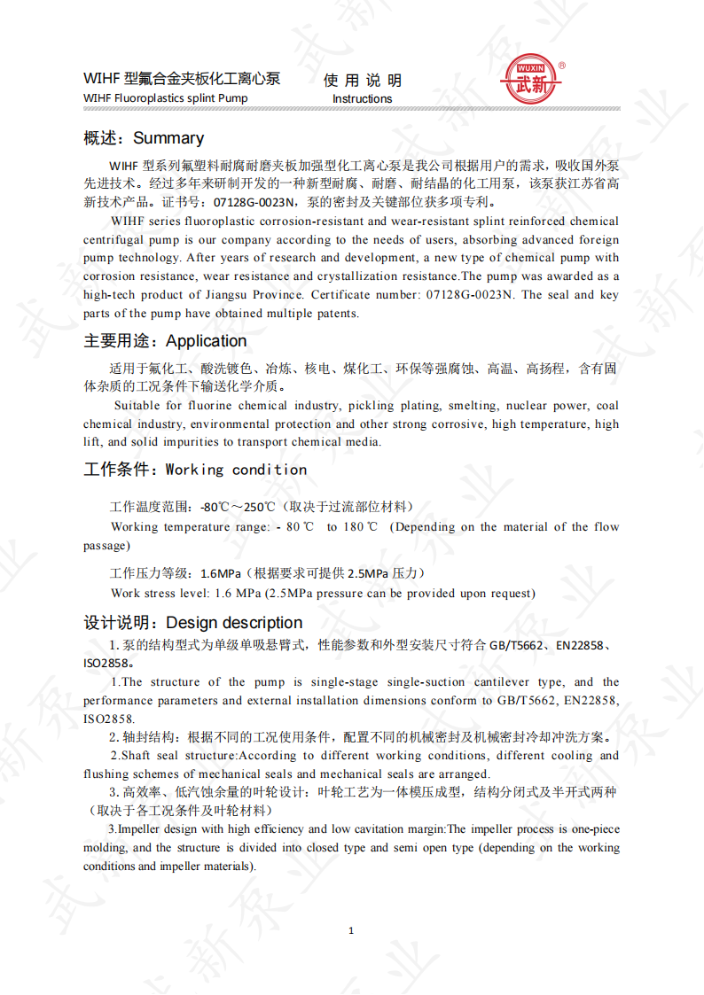 WIHF型系列氟塑料耐腐耐磨夾板加強(qiáng)型化工泵是我公司根據(jù)用戶的需求,吸收國外泵先進(jìn)技術(shù)。經(jīng)過多年來研制開發(fā)的一種新型耐腐耐磨耐顆粒結(jié)晶的化工用泵。泵的介質(zhì)過流部位全部采用耐腐、耐磨塑料制造,泵體外圍采用金屬夾板加固,機(jī)封為自行設(shè)計。