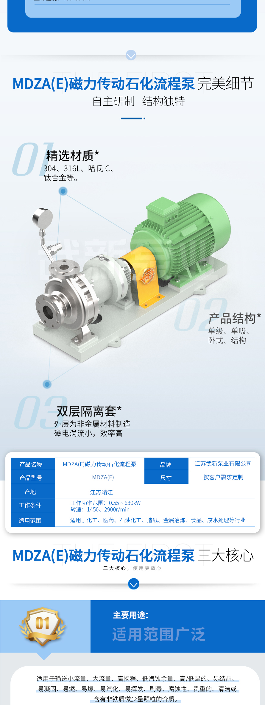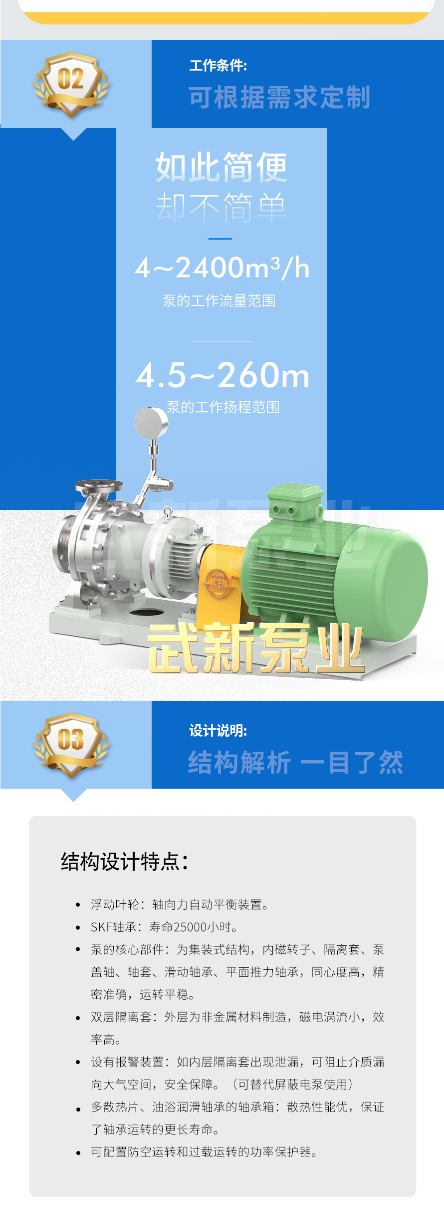 IMCH-L、IMCH-D型系列磁力傳動泵,是我公司自行設(shè)計(jì)的非金屬磁力傳動泵,用球墨鑄鐵作蝸殼體,經(jīng)特殊加工方法、經(jīng)高溫?zé)Y(jié)模壓,使氟塑料與蝸殼緊密牢固的合為一體,永不脫殼分離,既保持了金屬泵的機(jī)械強(qiáng)度性能,又具有優(yōu)越的耐強(qiáng)腐、抗氧化、耐溫、耐正、負(fù)壓等優(yōu)良性能。
